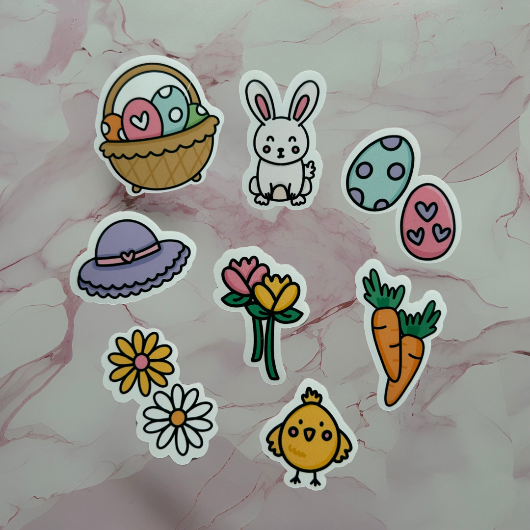 Introducing the Easter Vinyl Seasonal Sticker Pack, which includes icons from the popular bookmarks. This pack contains 8 different designs including: chick, bunny, easter egg basket, easter eggs, daisies, carrots, tulips & an easter bonnet which all vary in size and have all been exclusively designed for DBC.