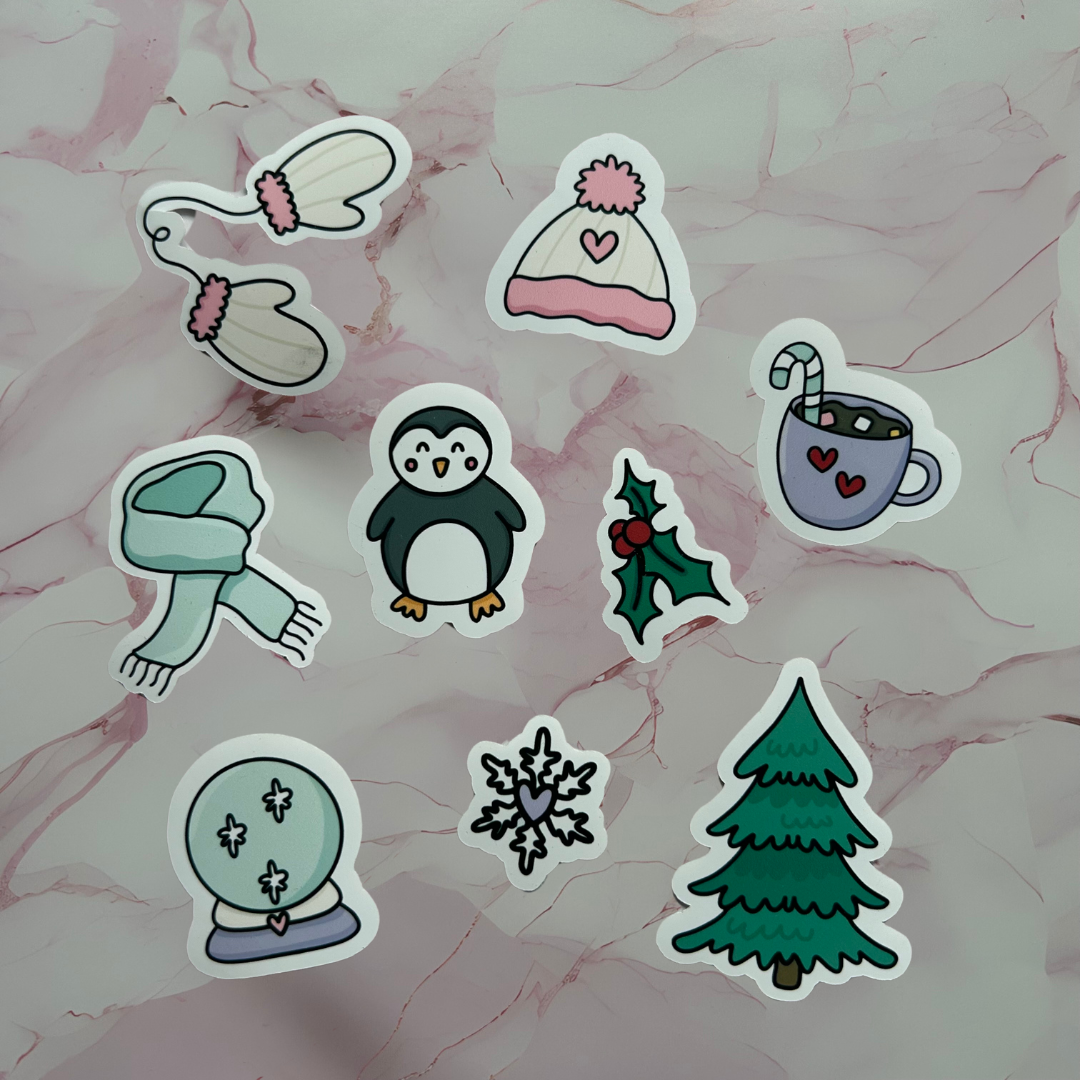 Introducing the Winter Seasonal Vinyl Sticker Pack, which includes icons from the popular bookmarks. This pack contains 9 different designs including: fir tree, mittens, hat, snow globe, holly, snowflake, penguin, scarf & hot chocolate mug which all vary in size and have all been exclusively designed for DBC.
