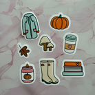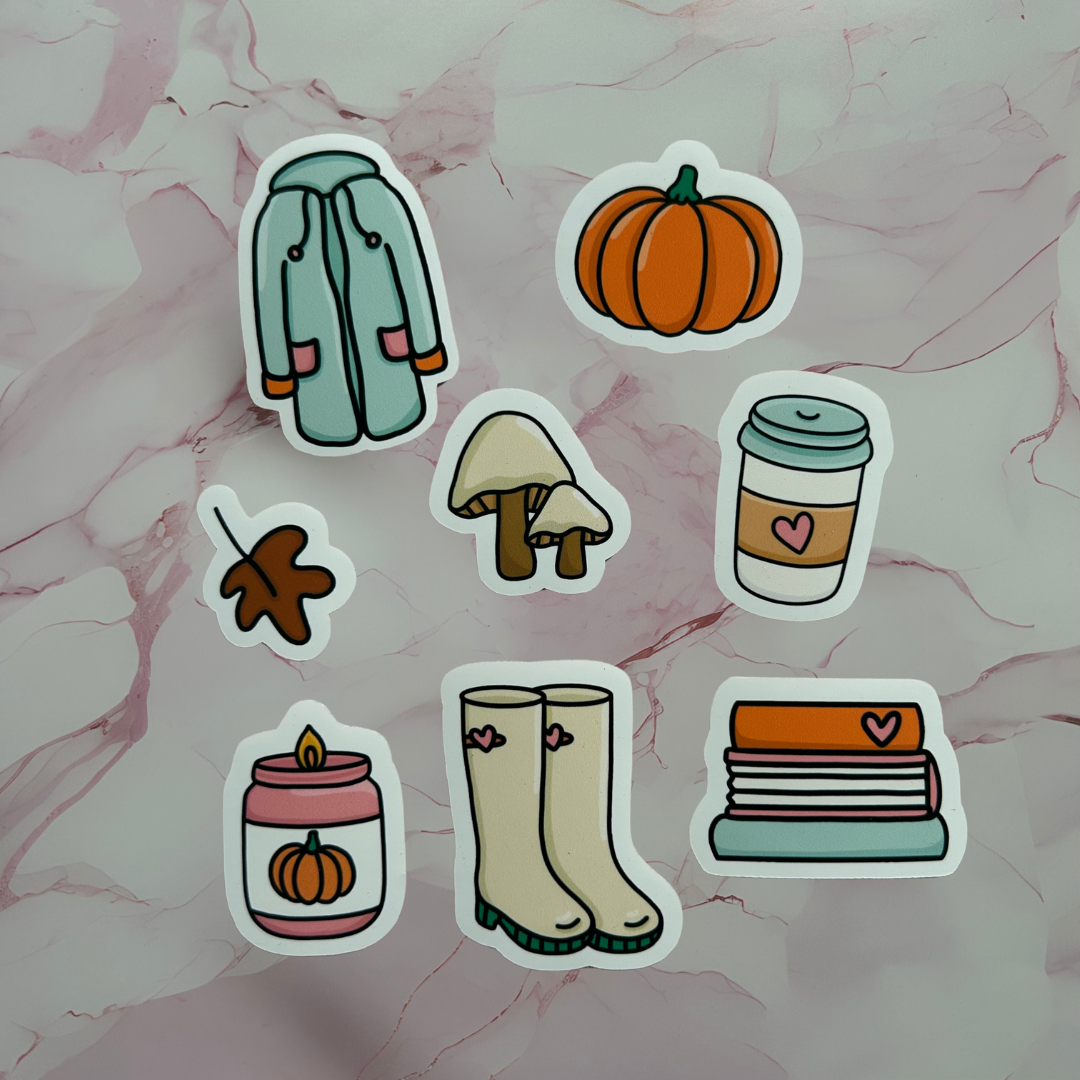 Introducing the Autumn Seasonal Vinyl Sticker Pack, which includes icons from the popular bookmarks. This pack contains 8 different designs including: raincoat, mushrooms, pumpkin, leaf, coffee cup, book stack, wellies & pumpkin candle which all vary in size and have all been exclusively designed for DBC.