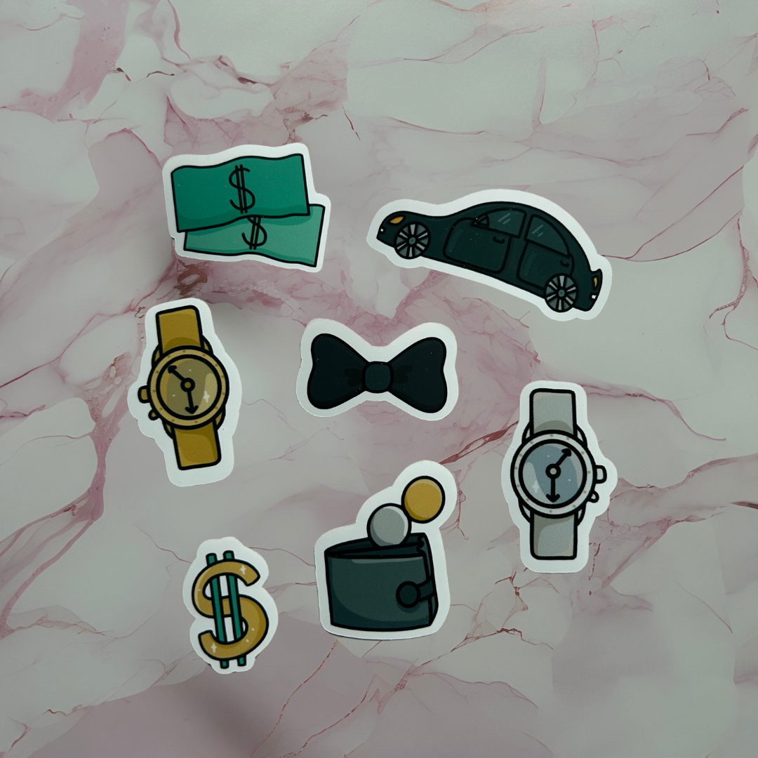 Introducing the Billionaire Romance Book Genre Vinyl Sticker Pack, which includes icons from the popular bookmarks. This pack contains 7 different designs including: silver watch, gold watch, wallet, money stack, dollar sign, bow tie & black car which all vary in size and have all been exclusively designed for DBC.
