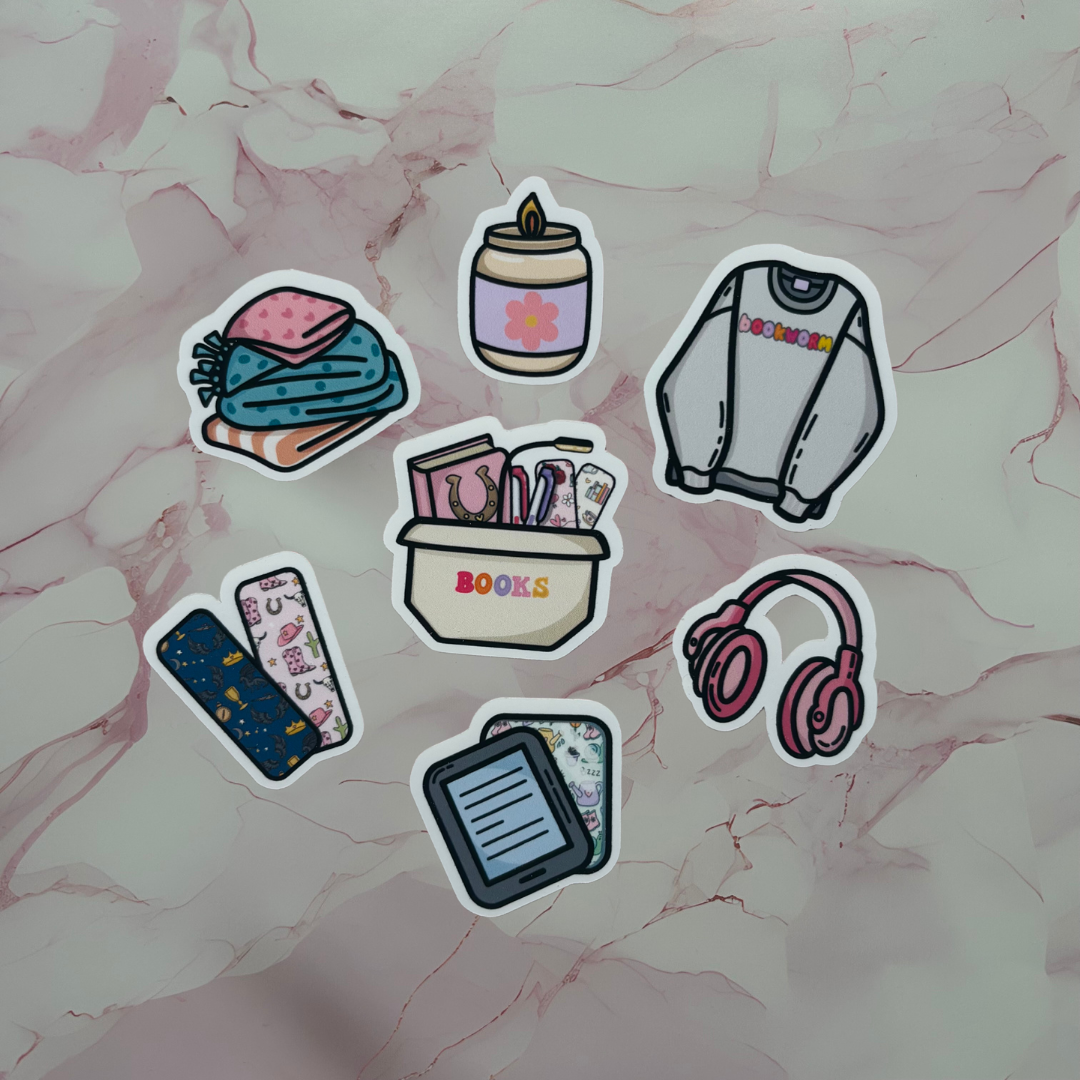 Introducing the Bookish Genre Vinyl Sticker Pack, which includes icons from the popular bookmarks. This pack contains 7 different designs including: DBC bookworm jumper, DBC bookish basket, kindle with DBC insert, DBC bookmarks, blanket stack, candle, and headphones which all vary in size and have all been exclusively designed for DBC.