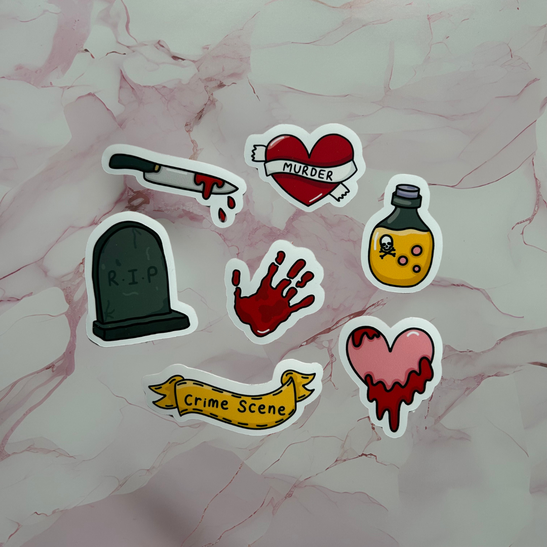 Introducing the Crime N' Thriller Book Genre Vinyl Sticker Pack, which includes icons from the popular bookmarks. This pack contains 7 different designs including: bloody knife, gravestone, murder heart, poison bottle, bloody hand print, bloody heart & crime scene tape which all vary in size and have all been exclusively designed for DBC.