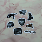 Introducing the Dystopian Book Genre Vinyl Sticker Pack, which includes icons from the popular bookmarks. This pack contains 8 different designs including: barbed wire, helmet/mask, gun, cctv camera, sector dbc badge, curfew sign, bird and rubble which all vary in size and have all been exclusively designed for DBC.
