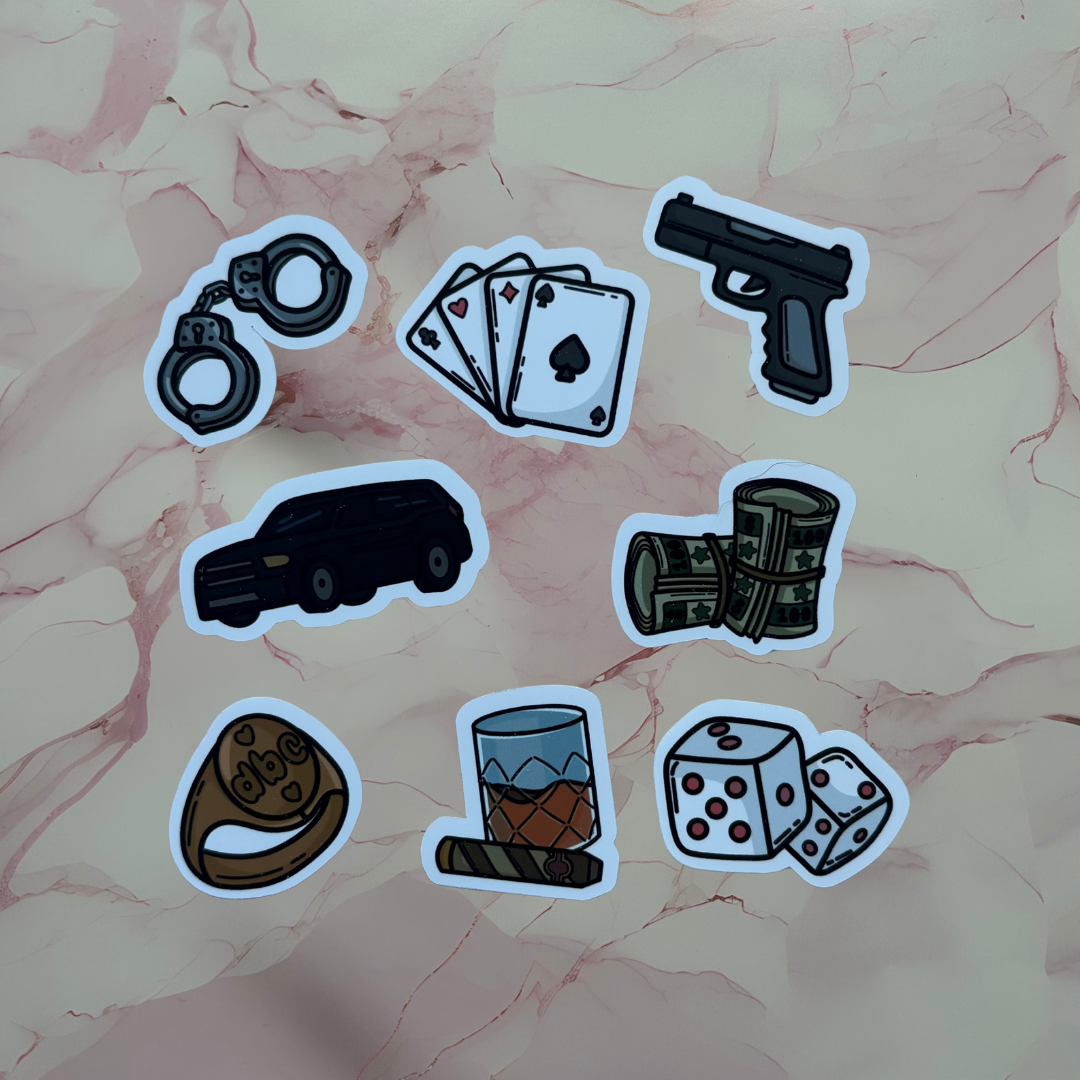 Introducing the Mafia Romance Book Genre Vinyl Sticker Pack, which includes icons from the popular bookmarks. This pack contains 8 different designs including: handcuffs, dice, car, cash stack, gun, dbc signet ring, whisky and cigar & playing cards stack which all vary in size and have all been exclusively designed for DBC.