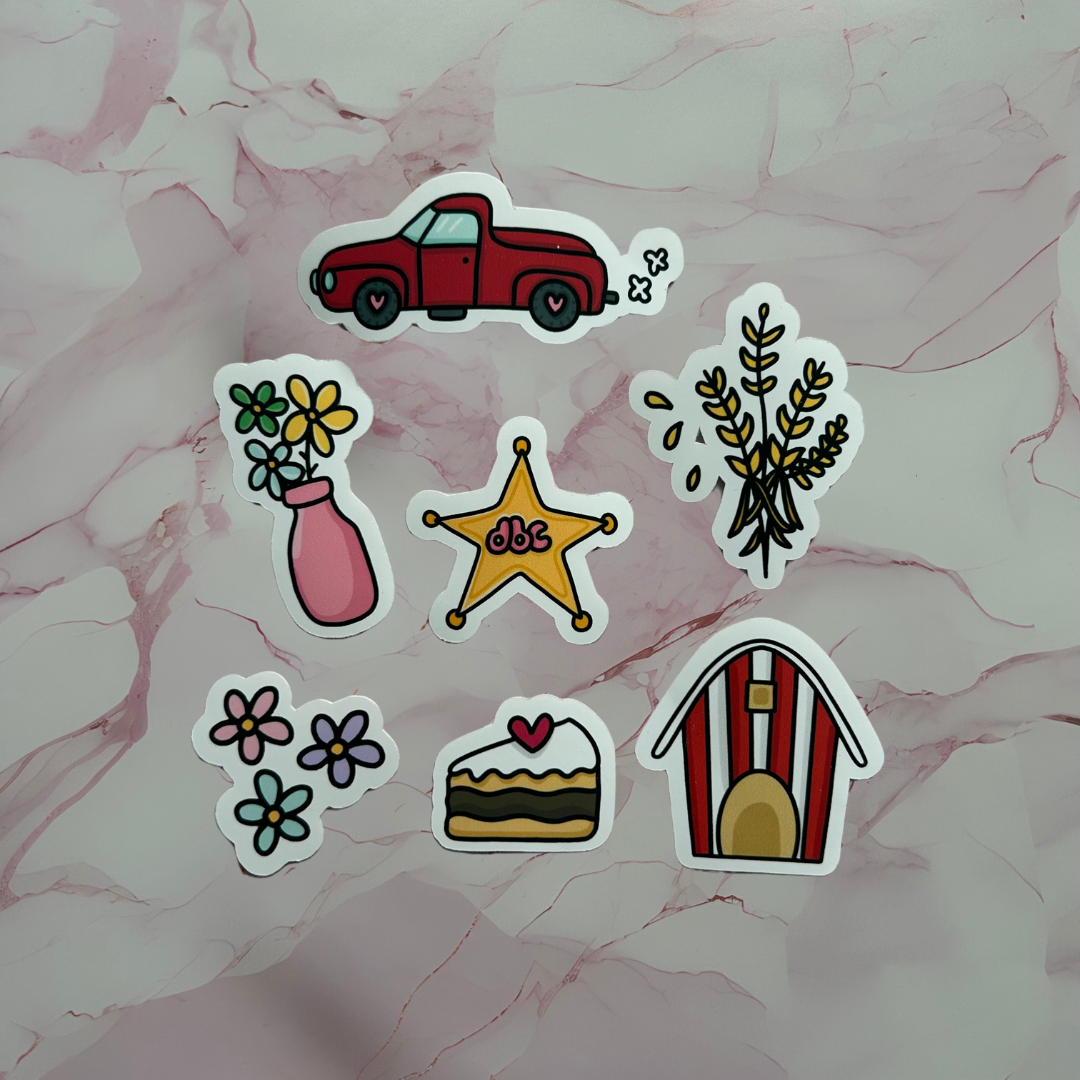 Introducing the Small Town Romance Book Genre Vinyl Sticker Pack, which includes icons from the popular bookmarks. This pack contains 7 different designs including: red truck, wheat, flower vase, cake slice, flower bundle, barn & DBC sheriff badge which all vary in size and have all been exclusively designed for DBC.