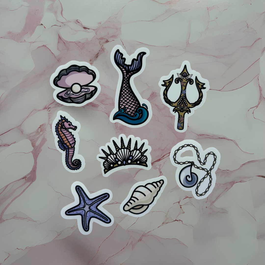 Introducing the Mermaid Genre Vinyl Sticker Pack, which includes icons from the popular bookmarks. This pack contains 8 different designs including: mermaid tail & wave, clamshell, trident, seahorse, crown, shell necklace, starfish and shell necklace which all vary in size and have all been exclusively designed for DBC.