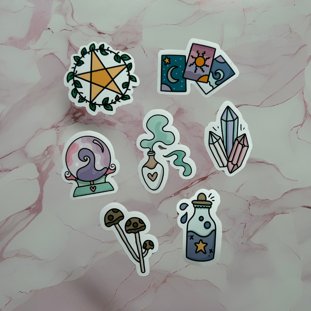 Introducing the Mystic Book Genre Vinyl Sticker Pack, which includes icons from the popular bookmarks. This pack contains 7 different designs including: crystal ball, two potion bottles, tarot card, crystals, mushrooms & hex which all vary in size and have all been exclusively designed for DBC.