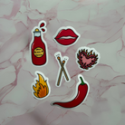 Introducing the Spicy Romance Book Genre Vinyl Sticker Pack, which includes icons from the popular bookmarks. This pack contains 6 different designs including: match sticks, flame heart, lips, flame, chilli & smut hot sauce bottle which all vary in size and have all been exclusively designed for DBC.