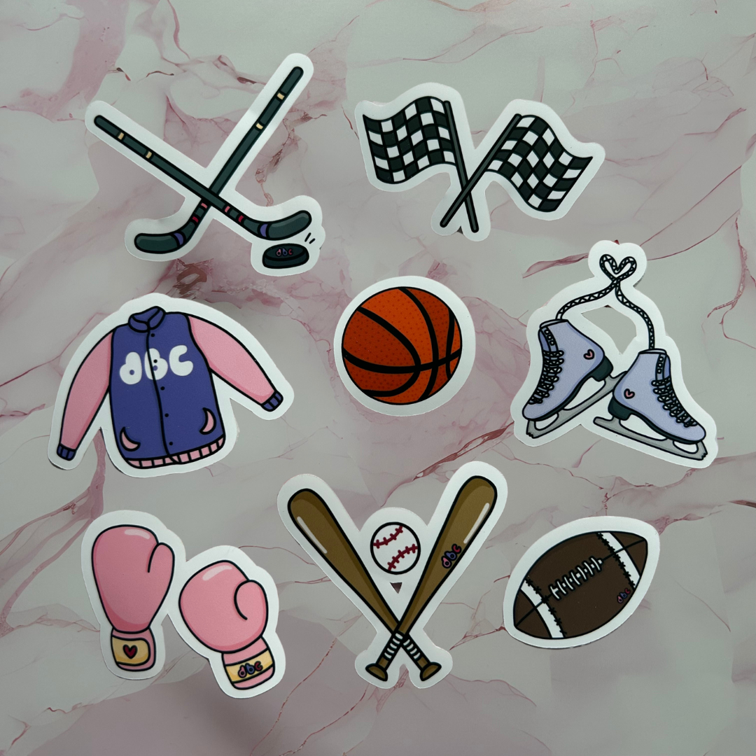 Introducing the Sports Romance Book Genre Vinyl Sticker Pack, which includes icons from the popular bookmarks. This pack contains 8 different designs including: F1 flags, baseball bat and ball, ice skates, basketball, hockey sticks and puck, boxing gloves, American football & DBC varsity jacket which all vary in size and have all been exclusively designed for DBC.