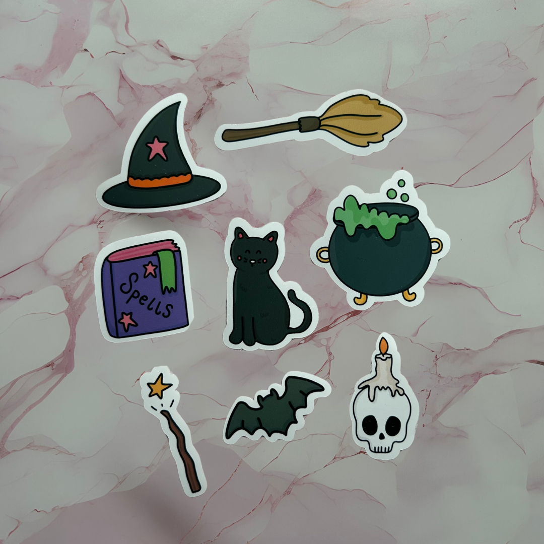 Introducing the Witchy Book Genre Vinyl Sticker Pack, which includes icons from the popular bookmarks. This pack contains 8 different designs including: broomstick, black cat, bat, witches hat, wand, skull candle, spell book & cauldron which all vary in size and have all been exclusively designed for DBC.