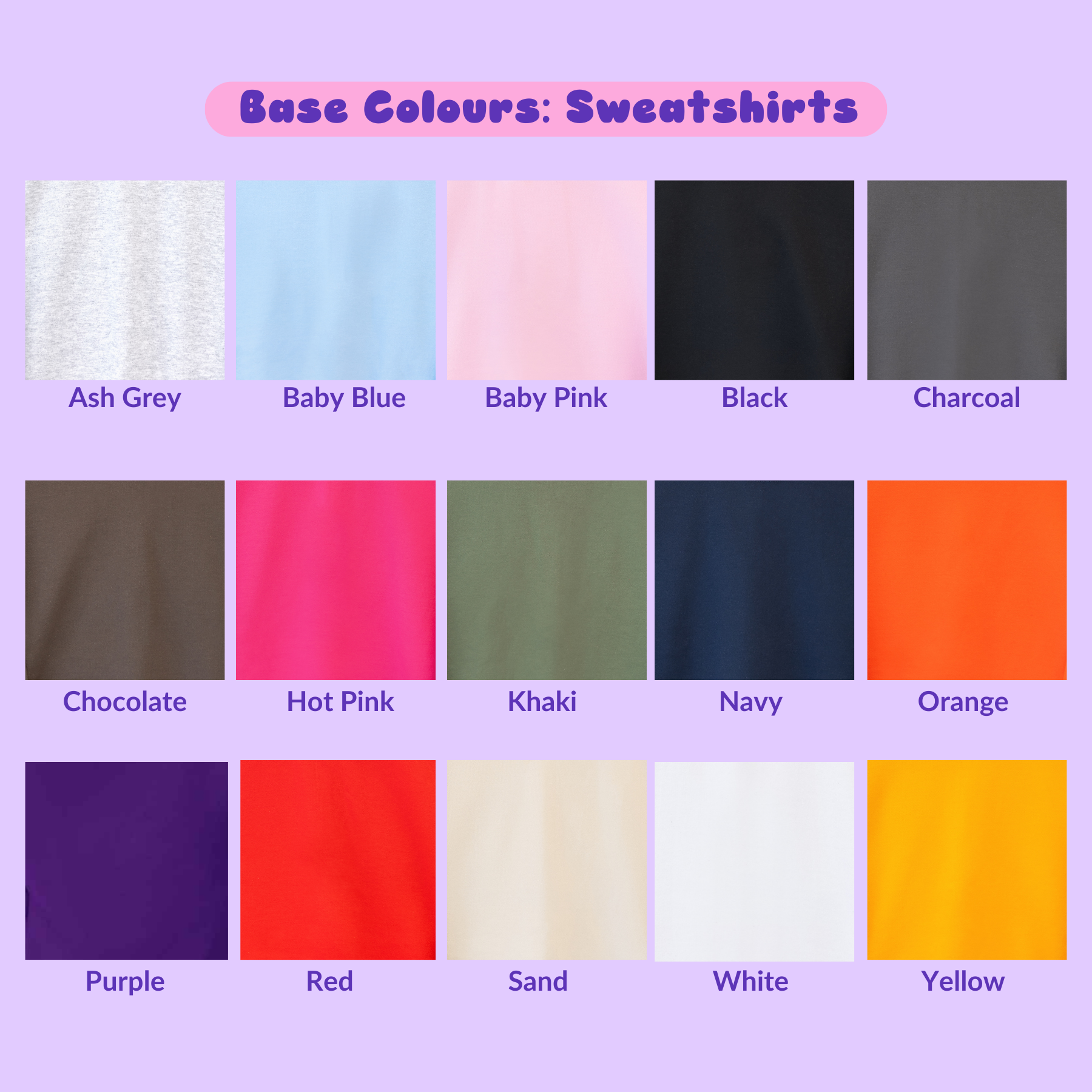 Sweatshirts are available in a variety of different colours from unisex sizes S-5XL. Sadly not all colours come up to a 5XL so please see the following list;