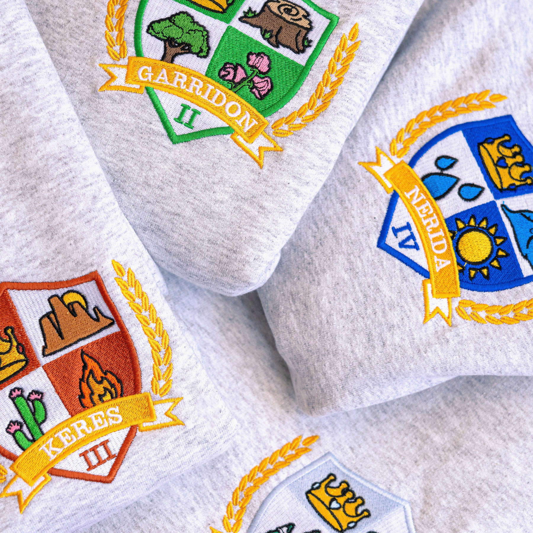 Introducing the DBC x Laura Carter Realm Embroidered Sweatshirt. The crest designs have been exclusively designed for our collection meaning no one else has them, and are officially licensed by Laura Carter. They are available in the four different realms..