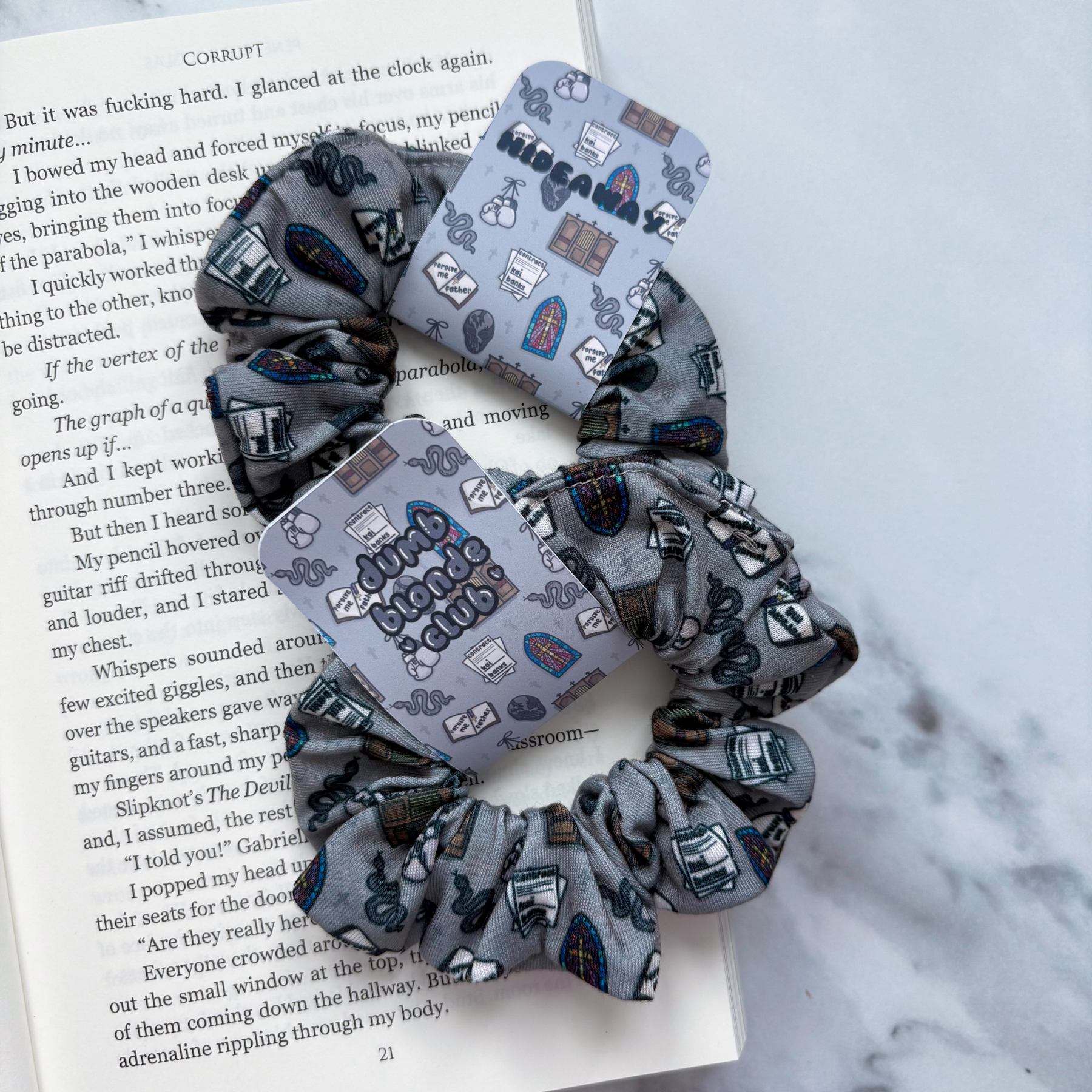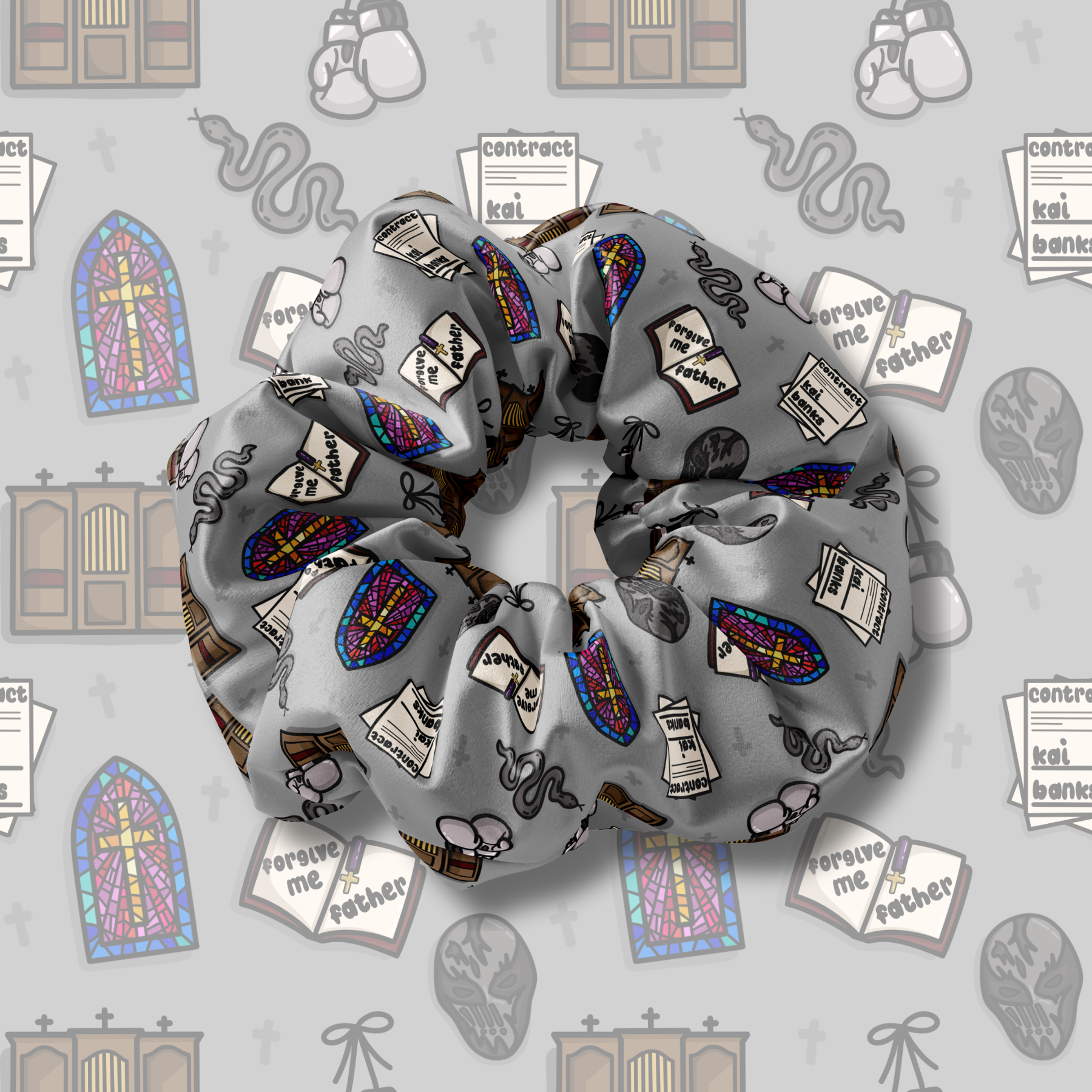 Introducing the Hideaway scrunchie, which is book two in the Devil's Night Series. This design is full of icons that relate to the book - some are obvious whereas some are little easter eggs if you haven't read the series! The icons include: Kai's Mask, Confessional Booth, Contract, Boxing Gloves, Stained Glass Window, Snake, and Forgive Me Father Book. It has been exclusively designed for Dumb Blonde Club meaning you can't get it anywhere else!