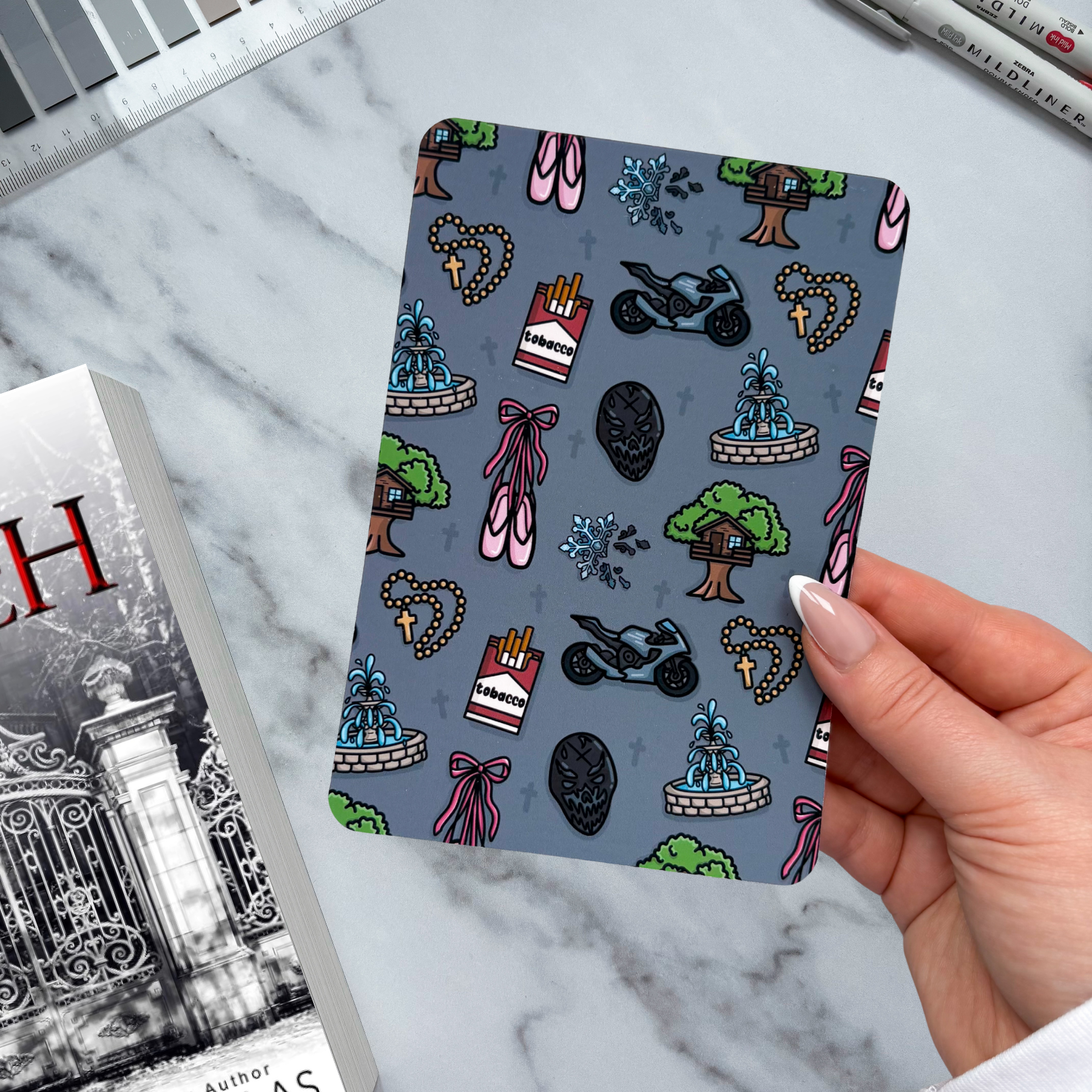 Introducing the Kill Switch e-reader skins, which is book two in the Devil's Night Series. This design is full of icons that relate to the book - some are obvious whereas some are little easter eggs if you haven't read the series! The icons include: Damon's Mask, Ballet Slippers, Treehouse, Rosary, Decaying Snowflake, Motorbike, Cigarette Packet, Water Fountain. It has been exclusively designed for Dumb Blonde Club meaning you can't get it anywhere else!