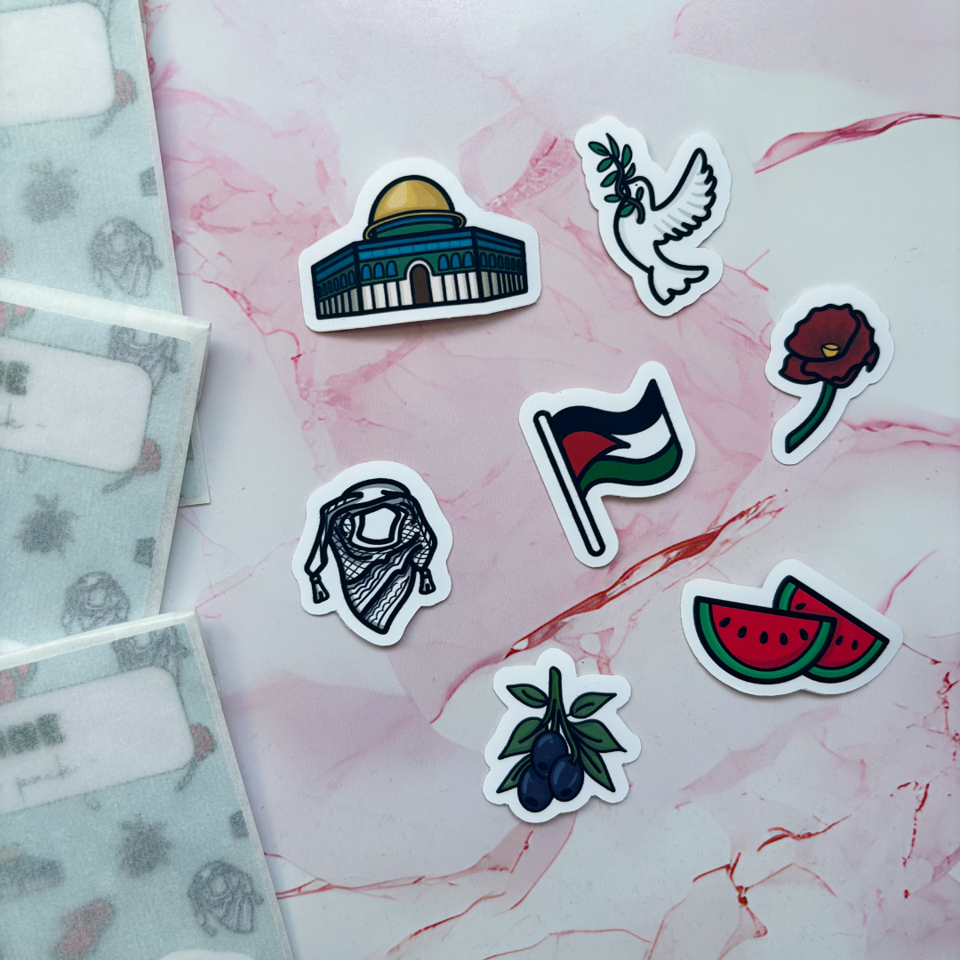 Introducing the Palestine vinyl sticker pack which includes icons inspired by Palestinians, their country, culture and most importantly their freedom. This pack contains 7 different designs including: Palestine Flag, Watermelon Slices, Keffiyeh, Olive Branch, Dove, Al-Asqa Mosque and a Poppy. This has been exclusively designed for DBC in collaboration with @kfennerart, meaning no one else has it. These are the perfect size to decorate your kindles, or even to spice up your laptops, phones, iPads or phones. They would also be great to add into any journals or planners.